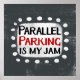 "Parallel Parking Is My Sylt" är en söt textdesign i grått med svart och röd text, tillsammans med en vit accentform och vita texturerade vita punkter runt den.