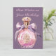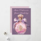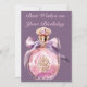 Vackert kort med rosa parfym flaska med jewel med ett säkert lock och juveler mitt i flaska. Bow i lila hues under locket. Glamor och lyx i ett kort. Kan redigera och anpassa kortet med eget meddelande.