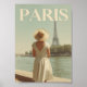 This elegant vintage poster captures a romantic Parisian moment: a woman in a flowing 1950s dress stands gracefully by the Seine River, gazing toward the Eiffel Tower. The scene is bathed in warm, nostalgic tones, with soft reflections on the water and classic Parisian architecture in the background. The artwork evokes the timeless charm of mid-century Paris, combining vintage fashion with iconic landmarks. A perfect piece for lovers of retro elegance, Paris, and classic travel art.