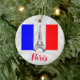 Visning kärlek för Paris, Frankrike i julhelgen med denna unika ornament! Den har Eiffel Torn och färg i Franskens flagga ovanpå en vit bakgrund. Teckensnittet och färg i texten kan ändras så att det passar dina önskemål.