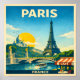 A mid-century inspired travel poster featuring Paris in a classic airline poster style with warm sunset tones and bold typography. Perfect for travel lovers and retro wall art collectors.
