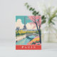 "blue and red paris", "rosa blommigt frankrike blommor", "eiffel torn and bridge", "city helgdag intrage", "seine flodremkomst", "vintage retro reseraffisch", "illustration grafik", "tavla souvenir vycard", "cherry blommar european capital", "vår träd europe landmark"