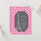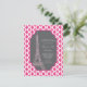 Modern födelsedagsinbjudan till flickor, tonåringar och unga kvinnor. Ljus rosa och vitt mönster på bakgrunden med mörk grått-etikett och rosa eiffel torn.
