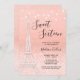 Ett glamoröst Paris var söt 16 födelsedagsfest inbjudan som du kommer att göra kärlek! Utformningen har en bakgrund med faserna faux guld glitter, Eiffel torn och sträng ljus. Det moderna teckensnittet för kalligrafskript är på väg att bli för din sweet sixteen. Alla stilar för text och teckensnitt kan ändras med verktygen online.