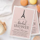 Åh, la! Gästerna i inbjudan för att duscha bruden i chic Parisian stil med vår elegant rosa och svart inbjudningskort för möhippa, med en illustration av Eiffel torn och modern men ändå nyfiken svartvit typografi. Kort på andra sidan Paris Romantik mönster med små kroissanter, makaroner, fåglar, ro, cyklar och Eiffel torn.