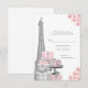 Paris RVSP-svarskort med vacker silver Eiffeltorn, eleganta Paris-presentförpackningar, silverglittrande högklackade skor på en rosa blomsterbakgrund. Detta vackra Paris-svarskort kan enkelt anpassas för din händelse genom att helt enkelt lägga till dina detaljer i den teckensnittsstil och färg, och formulering du väljer. Du kan också ändra bakgrundsfärgen. Detta är en tryckt design utan riktiga diamanter, juveler, glitter, etc.