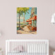 En charmerande gatukafé i Paris med rasstolar och röda varningar, mot ett tydligt blå himmel och en häpnadsväckande syn på Eiffel Torn. Lush Grey och blommor slutför den här idylliska scenen, perfekt för älskare av vintage resor art.