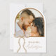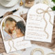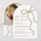 Denna pärlbågsformade bröllopsduschdesign "She's Tying the Knot" har en graciös, välvd layout i kombination med ett delikat bågmotiv för en mjuk, romantisk och feminin estetik. Den eleganta kompositionen skapar en chic och tidlös look, perfekt för att hedra den blivande bruden med ett stilrent och sofistikerat festtema. Baksidan visar ett älskat foto av det snart blivande paret, vilket ger en personlig och sentimental touch till firandet. Idealiskt för coquette-, klassiska och moderna bröllopsduschfiranden, denna förfinade design koordinerar vackert med matchande brevpapper, dekorationer och festdetaljer för en sammanhängande och polerad presentation.