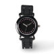 En svart bakgrund med pastellrosa pärlor längs övre och nedre delen.
