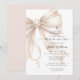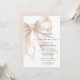 Denna inbjudan till första heliga kommunion har en mjuk, blushbeige satinbåge gjord av en pärlrosenkrans, komplett med ett dinglande kors och ett hjärtformat pärlcentrumdetalj. Den eleganta religiösa designen är placerad på en ren vit bakgrund med modern blandad typografi, vilket skapar en förfinad och meningsfull look för en flickas kommunionfirande. Perfekt för en katolsk sakramentshögtid, kombinerar denna inbjudan delikat rosenkranssymbolik med graciös script- och seriftext för en tidlös och feminin stil. Anpassa formuleringen med ditt barns namn, datum, tid och evenemangsinformation.