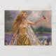 Fantasykort med en underbar älva i en gyllene dräkt som håller en färglös papegoja på handen.