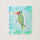 Lönsam papegoja med en glass på sin näsa. Papegojet ligger på blå och grönt himlar. En rolig fågel. Barnen kommer att kärlek det här pusslet. Perfekt för som gåva till parrot älskare.