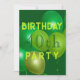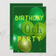 Grönt födelsedagsfest inbjudan för vuxen man eller kvinna. Stora ballonger i gröntens nyanser dekorerar båda sidor av dessa platta kort. Fet text på framsidan för att tillkännage ett party, med ett ställe för sin ålder. Perfekt för en milstolpe i mars, eller för att fira en irländare.