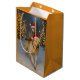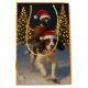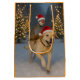 Humorous Christmas gift bag featuring a Partridge and yellow Labrador retriever in an apparent truce over the Christmas period! The Partridge is riding the Labrador in a snowy scene with Christmas trees twinkling in the background. Both the Labrador and partridge are wearing jaunty Santa hats.