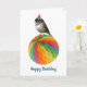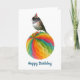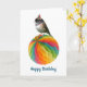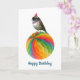 Lite junco med en party-hatt på en färgstark party-dekoration. Ge någon den här roligtens fågelfödelsedagskort.
