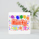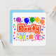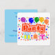 A Horizontal, Flat Greeting card, =optional, with Round Corners=optional, with a Drawing/Design, of the Word= Party, in the Color Red, and White, With Some Colorful Balloons, Confetti, and Gift packages. = (Drawing/Design by P.J.M.) on the front.