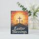 Ett hälsningskort i Påsk med tre kor som är tyst mot en gyllene solnedgång, symboliserar tro, hopp och återupplivandet av Kristus. Perfekt för att skicka välsignelser till familj och vänner.