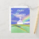 Vykort med min söt pastellscen i en kyrka och kor på grönt backe med regnbåge och blå himmel ovan.
