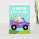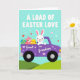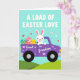 Designad med en söt vårscen visar detta kort en kanin i en stiliserad lila pickup som kör genom böljande gröna kullar under en blek turkos himmel 🐰. Små hjärtformer svävar runt scenen och ger en mjuk och tillgiven stämning, som om föraren levererar en omtänksam överraskning till någon särskild. Överst visas frasen “A LOAD OF EASTER LOVE” i stora versaler i en ljus färg som sticker ut tydligt mot himlen. På sidan av lastbilen står orden “Great Grandson” tryckta i en kontrasterande ljus färg, placerade som en etikett på dörrpanelen. I flaket på lastbilen slappnar en mindre rosa kanin av bland dekorerade ägg med mönster som ränder och prickar i blått, gult och rött 🐇. Några små hjärtan dekorerar också karossen, och knyter samman budskapet med bilden utan att tränga utformningen. Bakgr