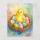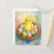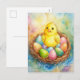 Ljusfärgat vykort med en söt gult chick sitta i ett bo bland färgstarka Påskägg. Mjuk färg och känsliga detaljer skapar en atmosfär av bekvämlighet, vår-värme och festglädje. Ett underbart val för Påsk hälsning!
