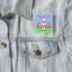 En knapp med min originaldatorgrafik av lite lammkaraktär, basket av Påskägg och ljusa, färgstarka blommor. Texten säger "Glad påsk"!