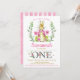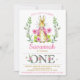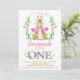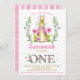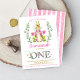 Påsk-flicka 1:a födelsedagsinbjudan har söt Peter Rabbit med eucalyptus löv och rosa blommigtar. Den här designen är perfekt för någon som har en Peter Rabbit Temed-födelsedagsfest.