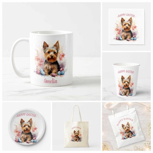 Returetiketter med en vattenfärg Yorkshire med blommor och chokladägg från Påsk. Anpassade.