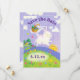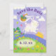 För Påskägg Hunts sparar du datuminbjudan med en vattenfärgsmålning av en vit kanin med basket färgade Påskägg med lila himmel, vita moln och blommigt i bakgrunden. Längst upp på kortet står det i lila typografi "Spara datum" med följande datum för att du ska kunna anpassa dig. På baksidan av kortet finns mer information om party i färgstark typografi att anpassa. Designad av världsberömd konstnär ©Tim Coffey.