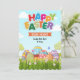 En illustration av inbjudan till Glad påsk Egg Hunt innehåller ett färgat dekorerat Påskägg ljugande på gräs fält under fjärilar.