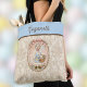 Denna charmiga totebössa har en charmerande påsk-"mormor"-gås i en ginghamskjorta som bär på pastellfärgade påskägg. Hon är omgiven av ett pastellfärgat kakel-mönster på en utsmyckning med en kokett stilbow. Vissa kanske till och med kallar henne för en vintage fynd-gås. Den fantasifulla pastellbilden är placerad mot ett beige och krämfärgat "textil"-stil damastmönster, och ditt namn visas högst upp mot en block av mjuk blå färg. Denna "cottagecore"-stils handväskor är bra för äggsökningar, för att handla till påskmiddag, eller för att bära dina gymkläder, eller vad du än behöver bära med dig.