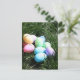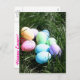 Det här postkortet har Påskägg i gräset. På baksidan står det "Glad påsk!" i rosa.