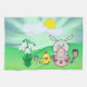 © PLdesign illustration: Kawaii Bunny och chick önskar dig Glad påsk. De färgader Påskägg med tass och klo. Färg bakgrund med moln, sol, snödroppar och gräs.