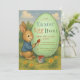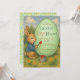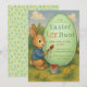 Den här påskäggsjaktsinbjudan har en söt kanin som målar ett stort gult ägg med texten till inbjudan. Kaninen är brun, bär en blå rock, har en pensel med droppande röd färg i handen och sitter på gräset, omgiven av gula blommor, med träd och blå himmel i bakgrunden. Titeln Påskäggsjakt är skriven med en dekorativ stil, varje ord i en annan färg: blå, röd och grön. Illustrationen har en gammaldags prägel.