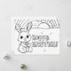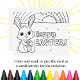 En söt kanin håller ett påskägg bredvid orden "Glad Påsk" på detta svart-vita påskkort för målande. Ett roligt och personligt sätt för ditt barn (eller du!) att skicka en påskhälsning.