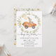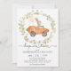 Hoppa på en påskbrunch och äggsökning! Bjud in dina gäster till din fest med denna super söta inbjudan som visar en söt kanin som åker i en karottbil omgiven av en frodig vildblommekrans.