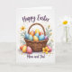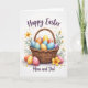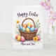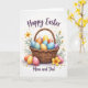 Denna gratulationskort har en rustik flätad korg fylld med färgglada dekorerade ägg, arrangerade som en mysig liten present som delas mellan nära och kära 🐰. Varje ägg har sitt eget mönster - små prickar, mjuka ränder och små blommönster - som blandar blå, orange, rosa, lila och gula färger på ett sätt som känns varmt och nära. Korgen är tecknad i naturliga tan- och honungstoner, med ett flätat handtag som svänger uppåt som en inbjudande båge. Några extra ägg vilar nära basen, nästlad bredvid små vita prästkragar och större gula blommor som lutar sig mot varandra som om i tyst sällskap 🌷. Bakom korgen reser sig bladrika gröna stjälkar som ramar in scenen och lägger till mjuk rörelse mot den vita bakgrunden. Nära toppen visas “Glad Påsk” i flytande mörk bokstavsstil, centrerad ovan