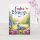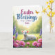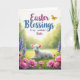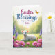 Denna gratulationskort visar en lugn vårscen med ett ungt, ulligt vitt lamm som vilar i friskt grönt gräs, dess lugna blick och något vända huvud ger ögonblicket en öm, nära-hjärtat känsla 🐰. Längs överkanten står budskapet ”Påskglädje till min underbara syster” i flytande bokstäver, med de första orden i strålande magenta och de återstående raderna i djupblått. En liten gyllene fjäril svävar nära det övre högra hörnet och tillför en lätt, tillgiven accent. I förgrunden reser sig rosa blommor med varma gula centra och höga lavendelblomsterax runt lammet, som en mjuk blomsterformad ram. Lammet öron visar svag rosa färg vid spetsarna, en söt detalj som passar bra med de närliggande kronbladen 🌷. Bakom allt detta tonar en solbelyst bakgrund ut i gyllene, oskarpa