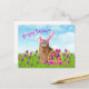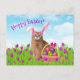 Föränderlig text, rolig katt, Påsk-vykort från BigTexFunkadelic. Har en orange katt klädd som en Påskhare i en fält av tulpaner och en bakgrund i blå himmel.