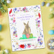 Vätskefärgad Påskhare-äggjakt och brunch blommigt vår party budgetinbjudan. Cute Bunny-kanin med tre Påskägg och en vacker boho-vildblomskål, inklusive kornblommor och trädgårdsblommor. Enkel att anpassa lila moderna handskriftsskript så att du kan lägga till all party-information. Originalkonstverk av konstnären Catherine Sweetman