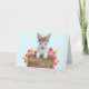 På framsidan av det här söta hälsningskortet i Påsk, är det en liten grått-kaninpek på träskylten. Bunten bär en del rosa och röda blommor, och märket omges av färgstarka blommor. På skylten står det "Glad påsk". Insidan har ett enkelt Påsk hälsning som du kan anpassa, om du vill.