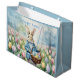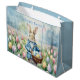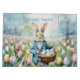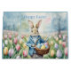 Vattenfärgad Påskhare som håller en basket av Påskäggen i en skugga av färgstarka tulpaner i Glad påsk hälsning