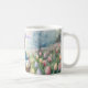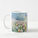 Vattenfärgad Påskhare som håller en basket av Påskäggen i en skugga av färgstarka tulpaner i Glad påsk hälsning
