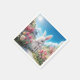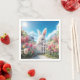 En söt, vit kanin från Påsk torkar över ett betesstaket omgivet av färgstarka tulpaner och en ljus trädgård i vår.