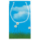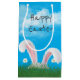 Späd vit Påskhare öron i gräs med vita daisy. Text kan redigeras.