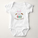 Denna berömvärda One-Biet Bodykostym har en flytande vit Påskhare som söker sig ut från en kanin hål för att hitta tre Påskägg med ljusa färgader. Hans budskap "Glad påsk" kan vara personlig med ett barns namn eller ert eget budskap.