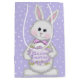 Späd vit Påskhare med Glad påsk-tecken och läppar på lila och vit polka-punktbakgrund.