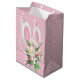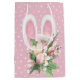 öron för rosa och vit Påskhare i en rosa blommigt bouquet på en rosa och vit polka-punktbakgrund.