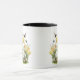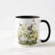 Kaffet mugg med en vattenfärgad illustration av ett brunt bunnyhoppande ut ur en Vår-trädgård av gult-tulpaner, daffodils och grönt med ett basket av speglade Påskägg i första åskådningen och färglösa fjärilar som snurrar runt. Ytterligare stilar och fälg och hantera färg finns tillgängliga.