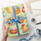 Ett förtjusande påskpresentpapper fullt av påskglädje med kaniner, ägg, morötter och påskkorgar.