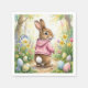 En charmig kanin i en rosa hoodie står mitt bland livfulla vårblommor och färgglada påskägg, som förkroppsligar den livliga känslan av en solig skogsdag